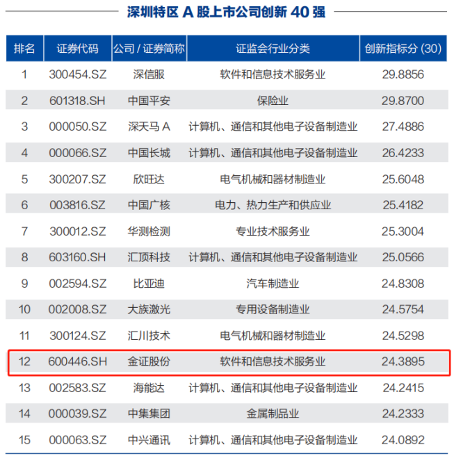 觀深圳巨變,書深圳奇跡。為紀念深圳經濟特區成立40周年,每日經濟新聞發布了《深圳特區A股上市公司可持續創新報告(2020)》。金證股份(證券代碼“600446.SH”)憑借在科技創新方面的突出表現脫穎而出,榮登“深圳特區A股上市公司創新40強”,名列12。