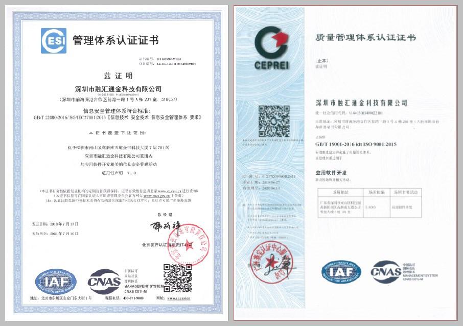 2018年7月,融匯通金正式通過ISO9001質量管理體系認證和ISO27001信息安全管理體系認證,標志著融匯通金在質量管理和信息安全管理方面,已經達到了國際化標準水平。