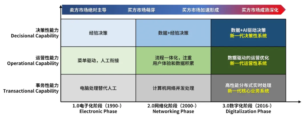 通常我們將金融科技的發(fā)展劃分為三個階段。早期(1.0電子化階段),證券公司的科技投入主要是購買基礎(chǔ)的交易清算等業(yè)務(wù)系統(tǒng),哪家證券公司先采用電子化交易系統(tǒng),就能在市場中占據(jù)優(yōu)勢,是典型的事務(wù)性能力競爭。運營性能力依靠手工操作,決策性能力依靠人腦經(jīng)驗。